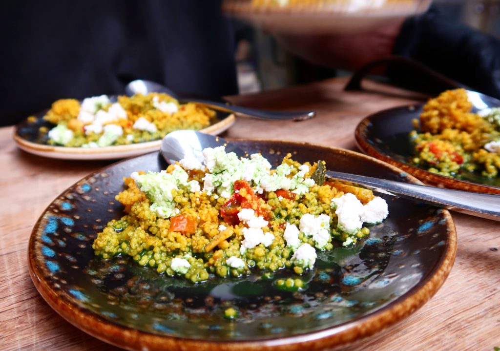 Tijdens de uitleg kregen wij heerlijke bites te proeven, bereid met Tabasco. Wist je dat je zelfs cocktails met Tabasco kan maken? Ik dronk een virgin Margarita met tabasco. De eerst bite bestond uit frisse couscous met feta, limoen en groene tabasco. Hierna volgde een gegrilde oester met granaatappelpitjes en bruschetta met hummus, courgette en bessen.