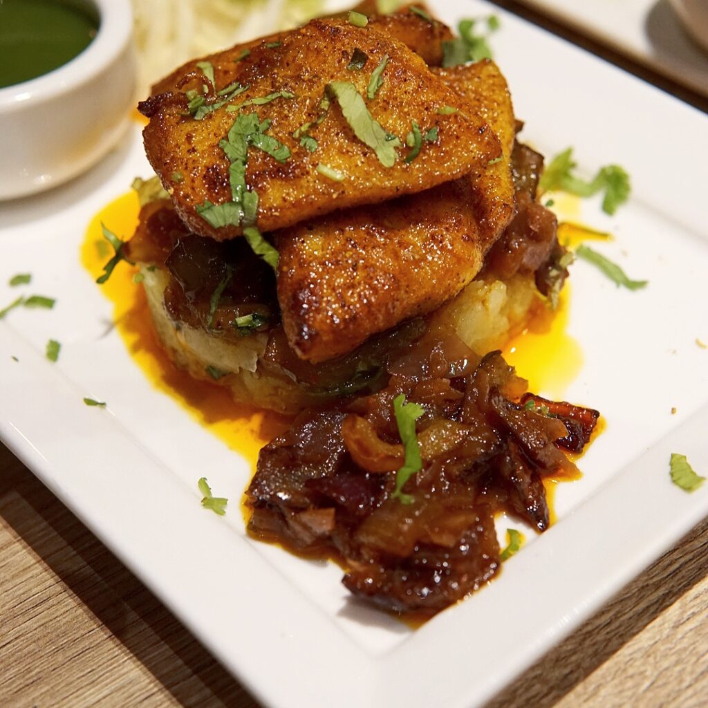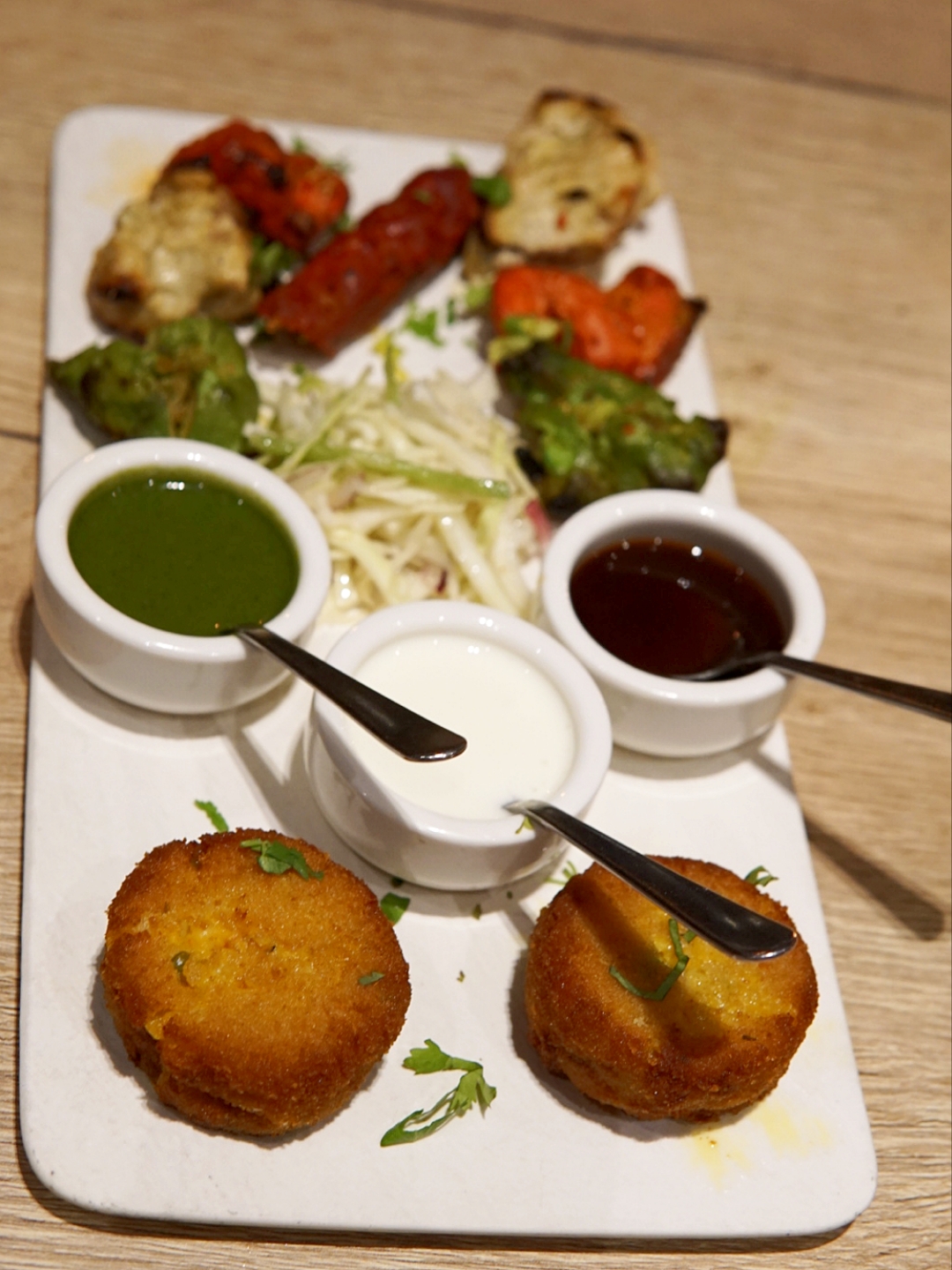 We begonnen ons avond met een plateau voorgerechten met hierop drie soorten kip en lamsvlees uit de tandoor en Aloo Tikka is een gebakken aardappelkoekje omhuld met kikkererwtenbeslag. Daarnaast kregen we Fish tava, betekent letterlijk gebakken vis. De gebakken zeebaarsfilet werd gepresenteerd op een bedje van gekruide aardappelpuree. Deze gerechten waren geïnspireerd op Indiase streetfood en stuk voor stuk zalig!