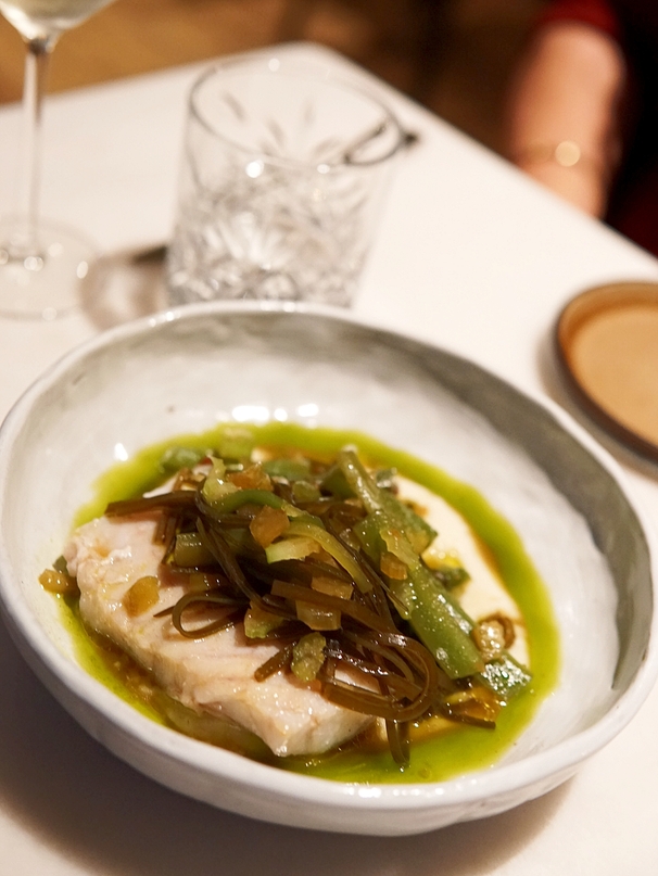 Daarna volgde een perfect gebakken roodbaarsfilet, geserveerd met knolselderijpuree, frisse strengelsla en een hint van kombu, die het gerecht een subtiele umami-smaak gaf. De kabeljauwfilet met prei en aardappel bracht verfijnde eenvoud, waarbij de kwaliteit van de vis volledig tot zijn recht kwam.