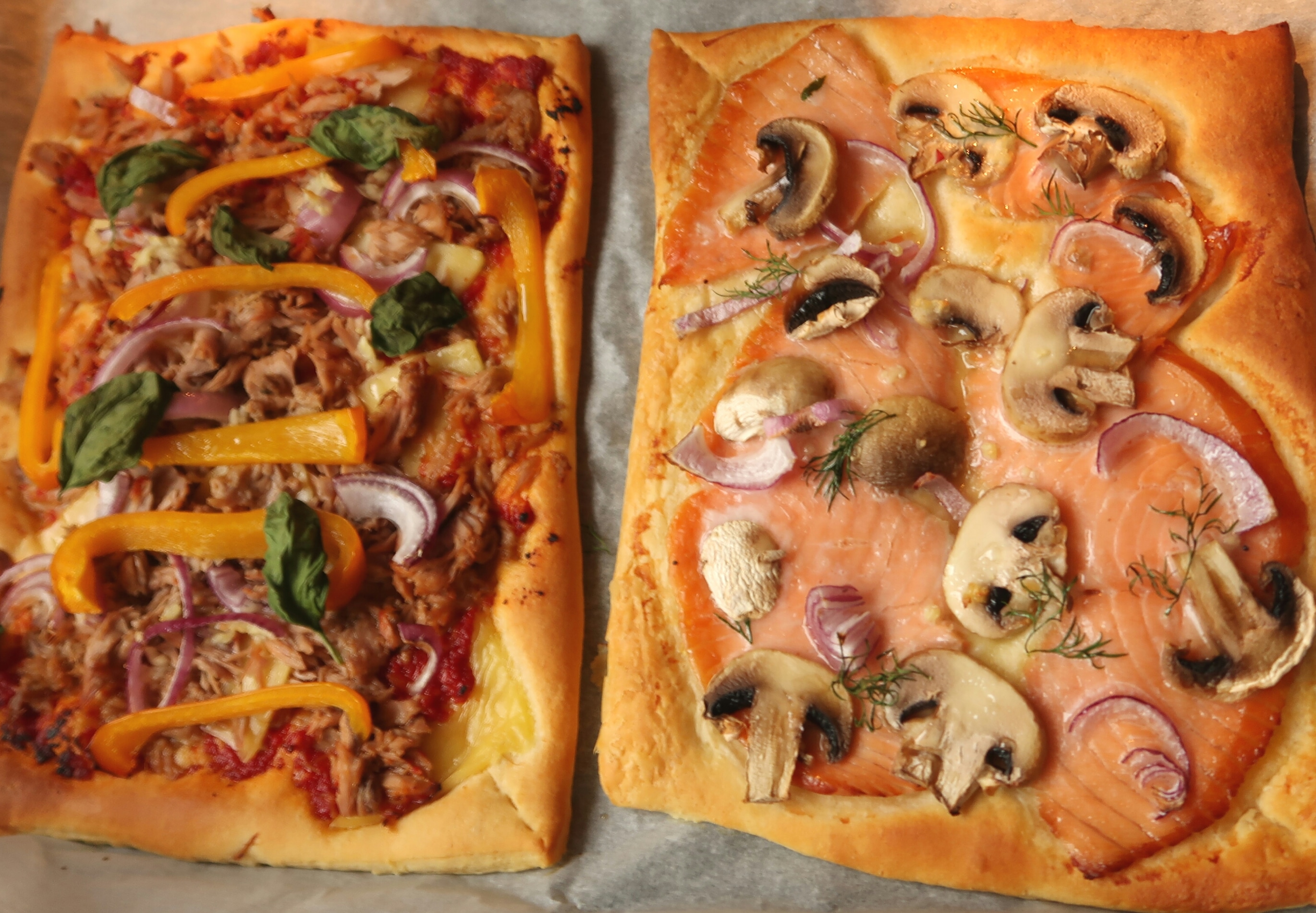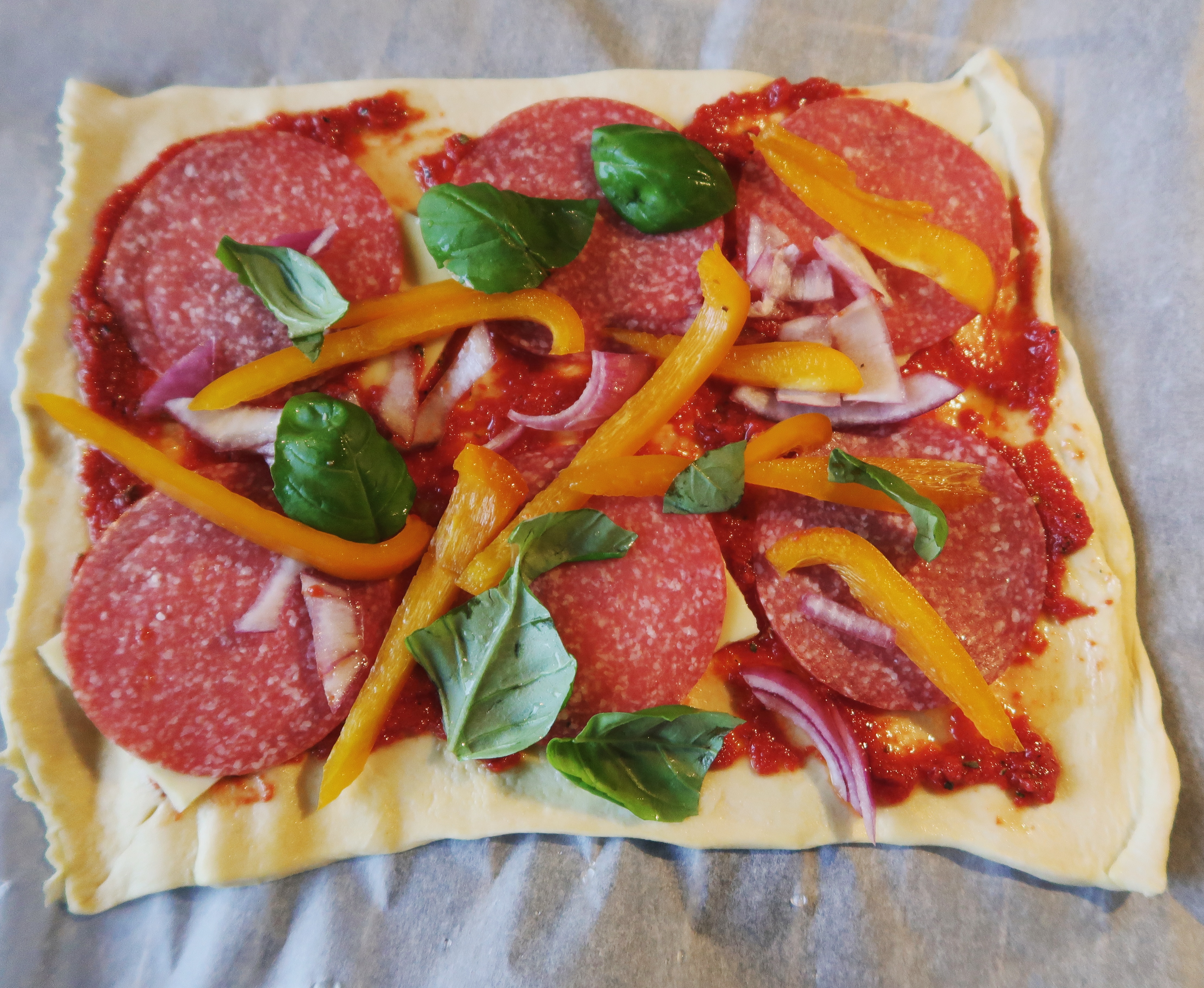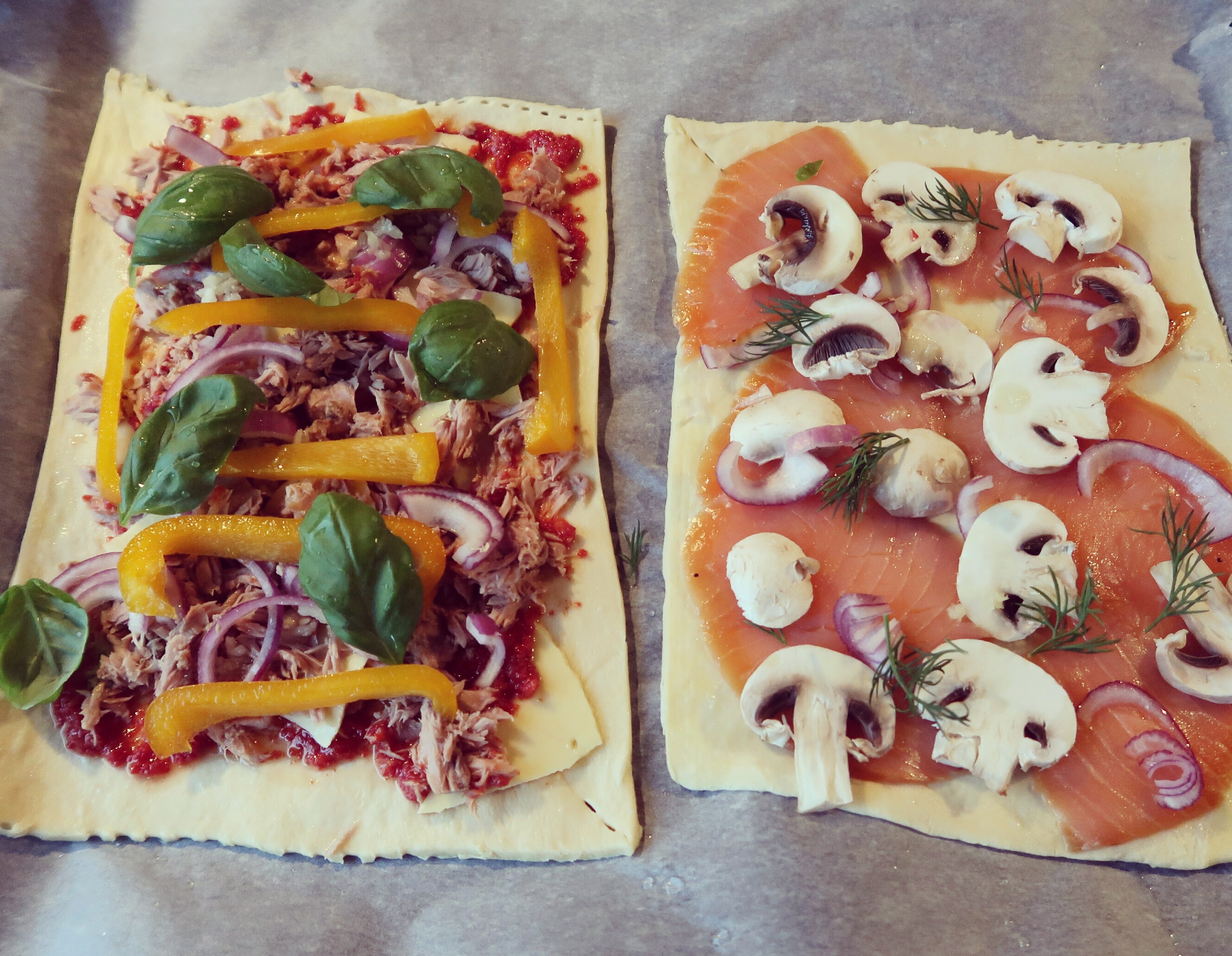 Flammkuchen is een soort pizza op brooddeeg. Heerlijk en minder zwaar dan een echte pizza. Een ideaal receptje voor als je niet lang in je keuken wilt staan, de flammkuchen zijn zo klaar! Je kan zelf je deeg maken, maar ik vind het wel makkelijk om croissantdeeg uit blik te gebruiken. Wat helemaal mooi uitkomt is dat de croissantdeeg ook nog zonder roomboter is. Met de croissantdeeg krijg je een heerlijke brooddeeg met een lichte romige smaak. Je kunt de flammkuchen natuurlijk versieren met wat je maar wilt. Hieronder vind je 3 leuke ideetjes.