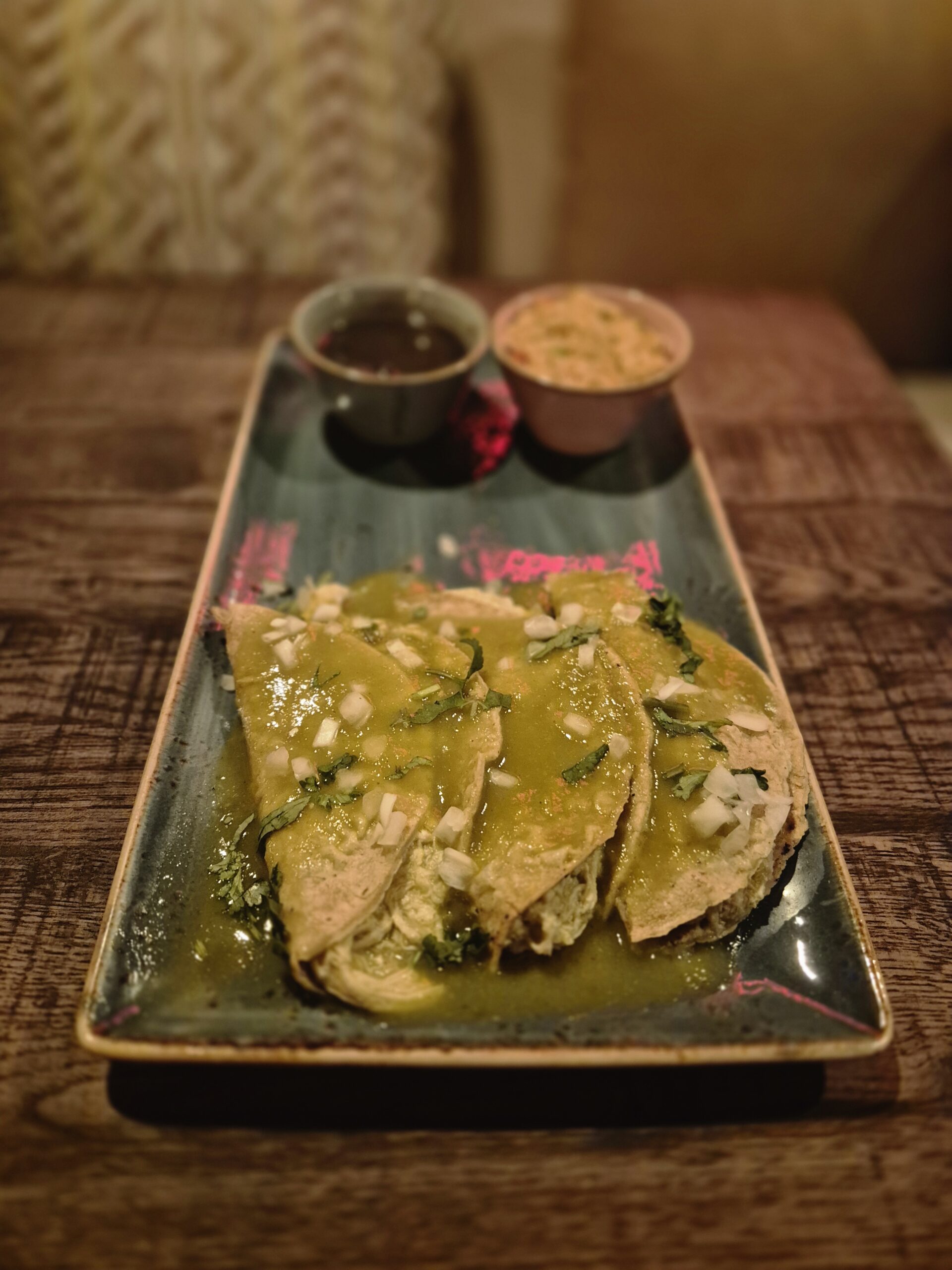 Daarna was het tijd voor taco’s. De taco’s kun je zelf samenstellen met rundvlees, kip, kaas of een vegetarische vulling met paddenstoelen. De ceviche op taco was heerlijk fris, en de enchiladas met kip met een groene saus waren smaakvol en zacht. De emmoladas met kip en bonensaus was mijn favoriet.