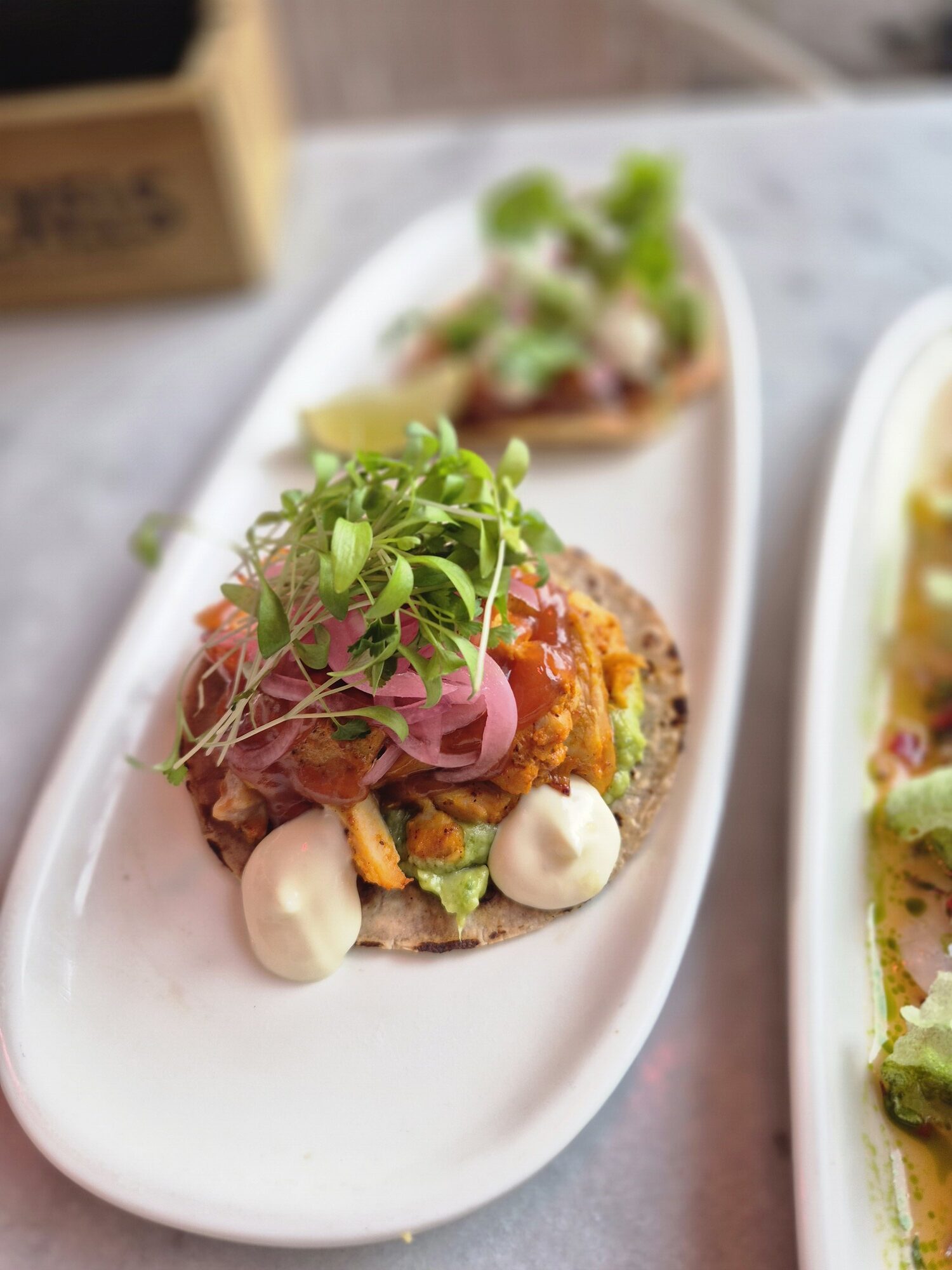 De voorgerechten maakten het lastig kiezen, dus gingen we voor drie toppers: een tiradito ceviche van corvina, kiptaco’s en een tostada met tonijntartaar. De presentatie was prachtig en de smaken spot on. De ceviche was fris, niet te zuur, en de taco en tostada precies zoals je ze hoopt te krijgen.