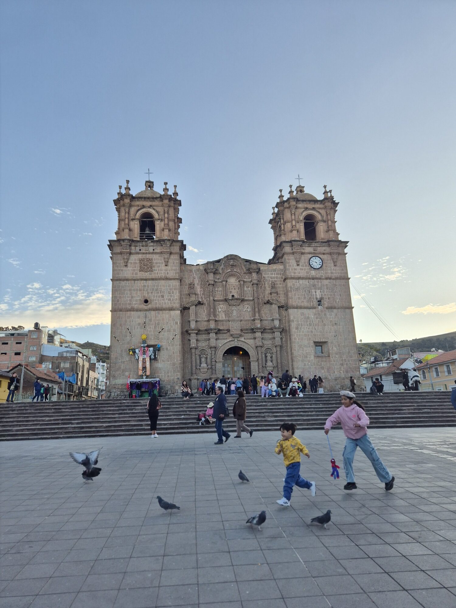Het bergstadje Puno ligt zo’n 3800 meter hoogte met een traditionele, bijna dorpse sfeer. Het is klein, overzichtelijk en voelt meteen anders aan door de frisse berglucht en lagere temperaturen. Hier lopen de locals dik ingepakt, en ik snap waarom. De stad zelf is niet groot, maar heeft genoeg om even rond te struinen: een mooie kathedraal op het centrale plein, wat toeristenwinkels met kleurrijke souvenirs en ook een paar moderne winkels.