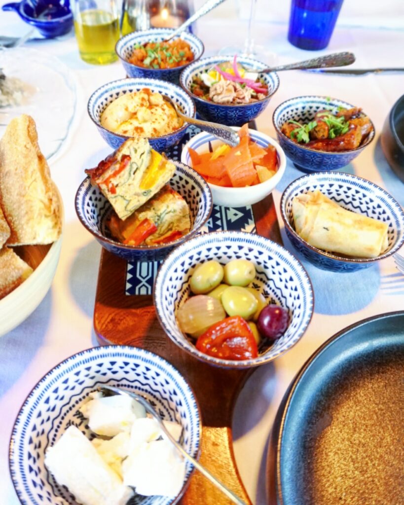 Daarna kwamen de mezzes, een tafel vol kleine hapjes. Hummus, worteldip, merguez, olijven, feta, zalm, Tunesische salade, oesters met Tunesische salade en Brik. Brik is een Tunesische pasteitje van loempiadeeg, gevuld met ei, tonijn en kaas.
