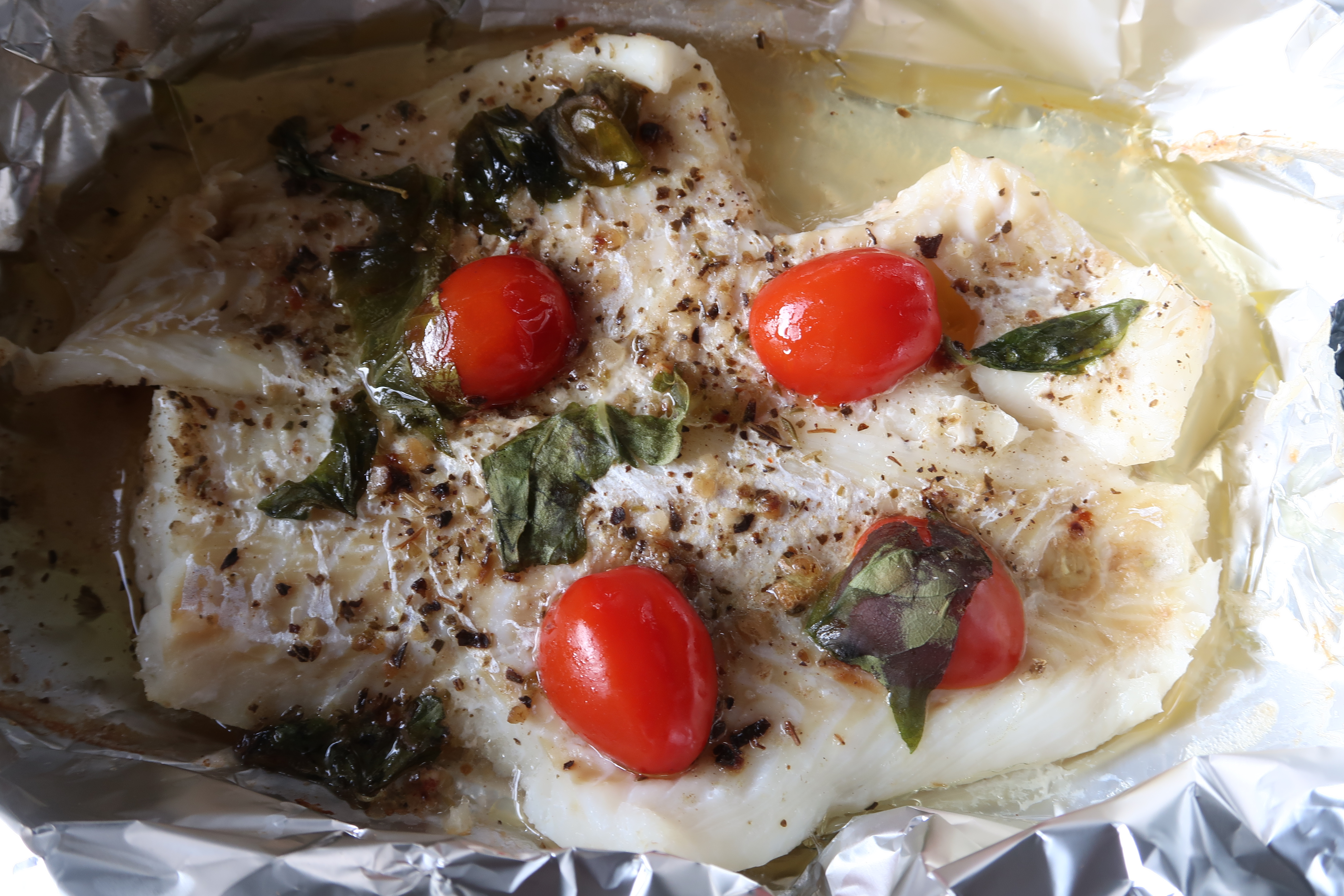 Verwarm de oven voor op 200 graden. Pak een ovenschaal en scheur ruim aluminiumfolie af voor elk stuk vis. Leg de kabeljauw op de folieen strooi er Italiaanse kruiden overheen. Snijd een snoeptomaatje door tweeën en leg dit samen met een blaadje basilicum op de kabeljauw. Schenk een klein beetje olijfolie erover. Vouw het pakketje van folie dicht. Zorg dat je het niet te strak dicht vouwt. Plaats de ovenschaal in de oven en laat dit 20 minuten stomen.